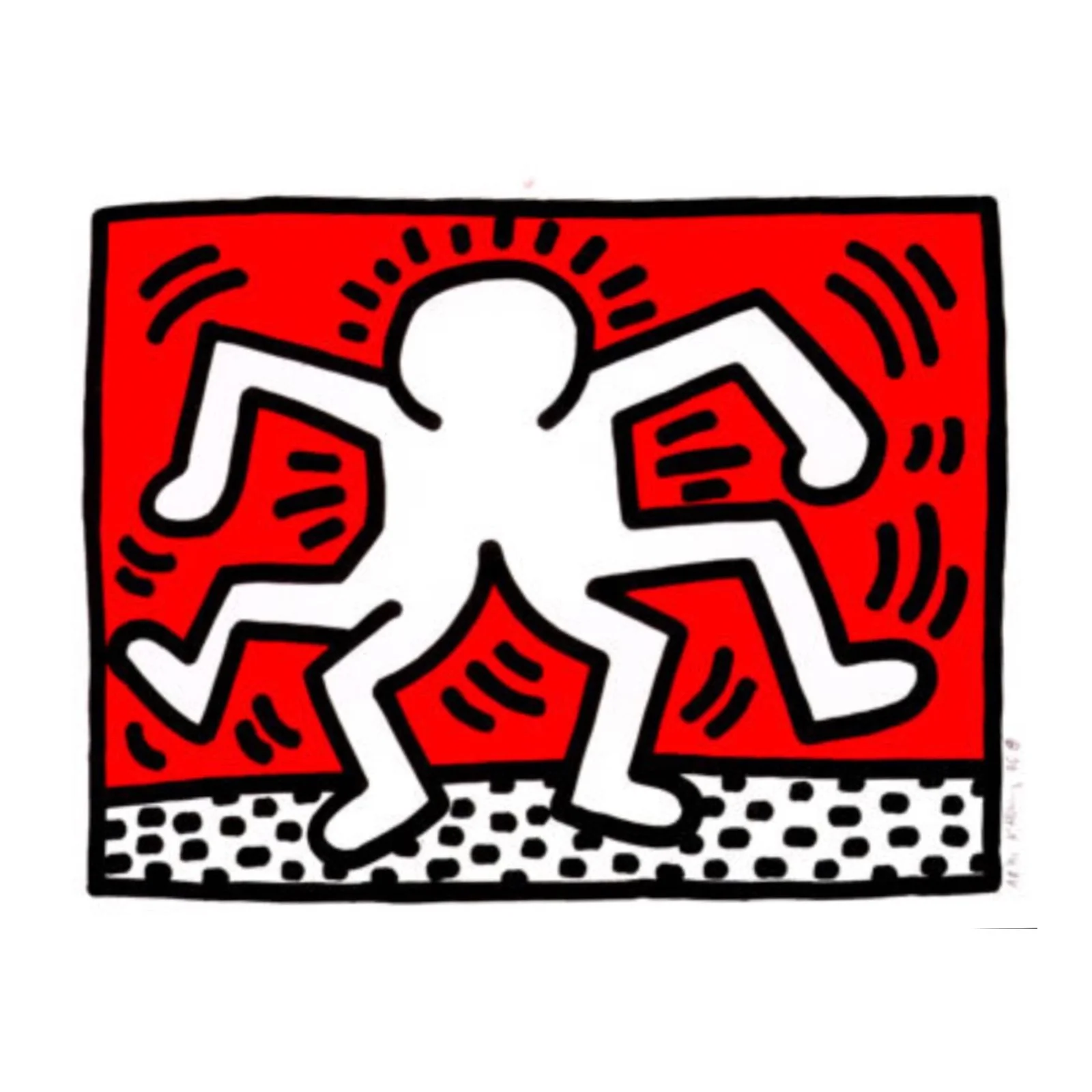 This particular example, signed and dated 1986 and numbered 34/85, reflects the artist’s signature style at its creative peak. The bright red field and energetic black-and-white figure reinforce Haring’s exploration of motion, community, and the shared human experience. Created for the Bill T. Jones/Arnie Zane & Company project, the work also embodies Haring’s commitment to social activism and artistic collaboration during a pivotal time in his career.