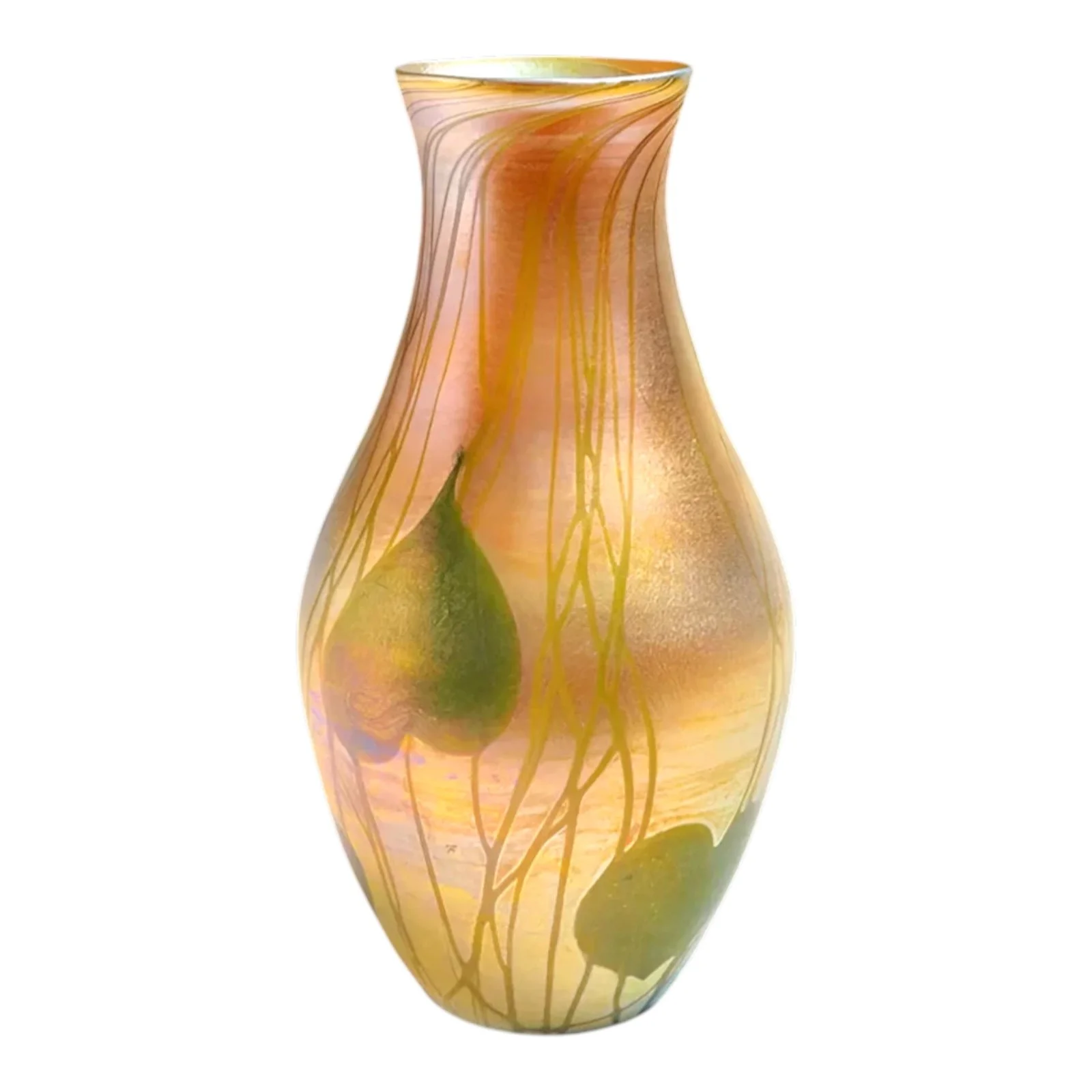 Louis Comfort Tiffany Studios Favrile glass vase with iridescent leaf and vine motif — embedded iridescence, signature format, pontil finishing, and surface restoration exposure must align before authentication and valuation tier placement.