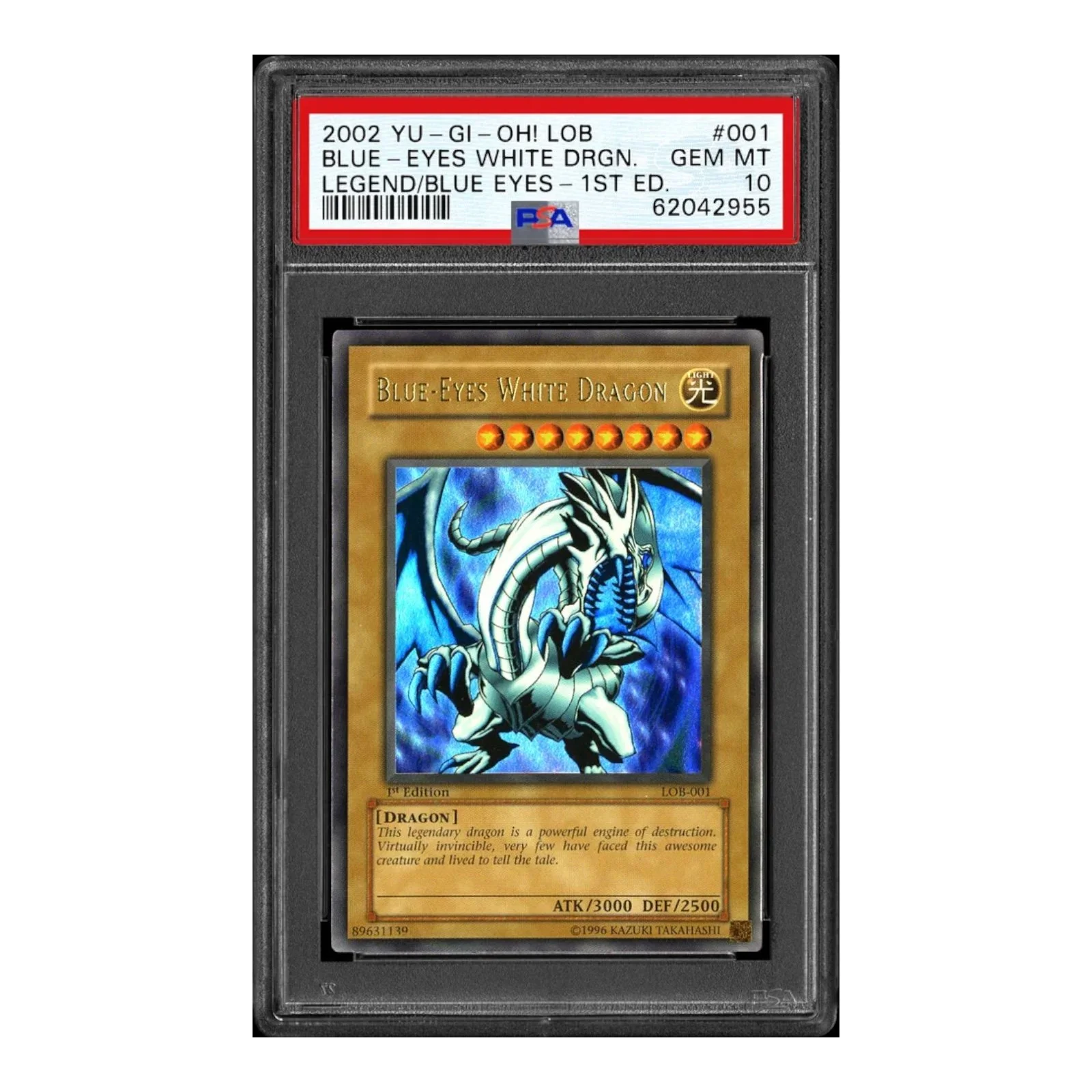 A high-grade PSA 10 Yu-Gi-Oh! Blue-Eyes White Dragon LOB-001 1st Edition